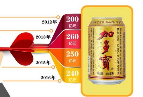 據媒體此前報道,2015年加多寶的銷售額在250億元左右。另外,加多寶在2017年3月的一次公開會議上表示其2016年的銷售收入是240億元。而內部人士透露,加多寶2017年的銷售總收入預計在150億元左右。